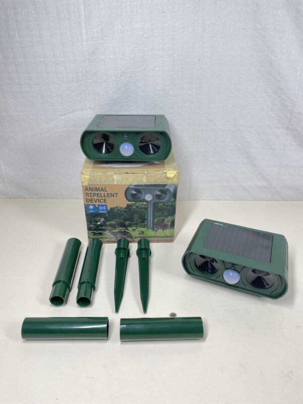 This 2 pack of RoamRover Ultrasonic Cat/Pest Repellents are listed as new other as their box has been opened but the pair inside are in a fantastic condition, showing no signs of previous use or damage at all. They have been turned on and tested and they work perfectly. The garden spikes are included and showing no signs of use or damage. Please see images.