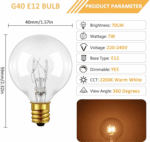 • 【E12 G40 Outdoor Replacement Light Bulb 】25 packs * E12 G40 7W outdoor bulbs. ø40*59MM, input voltage 220V-240V. G40 outdoor bulbs emit 70 lumens of 2200K warm white light, creating a warm and comfortable atmosphere for your party.