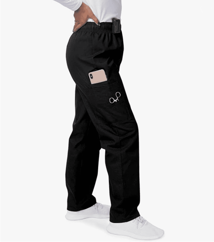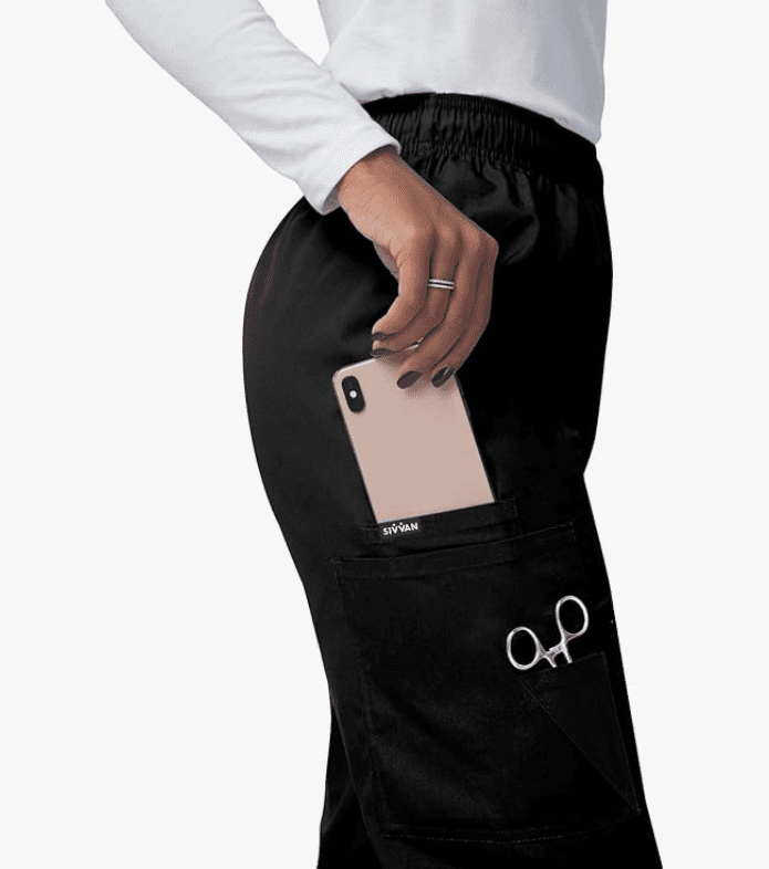 - Cargo pockets, cell phone pocket, and extra space pocket on right leg