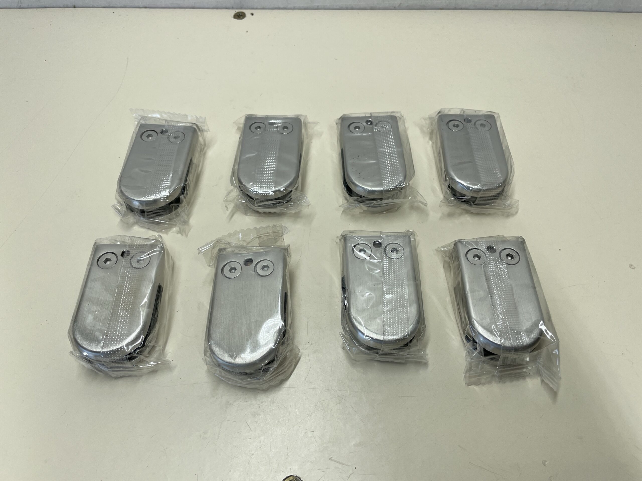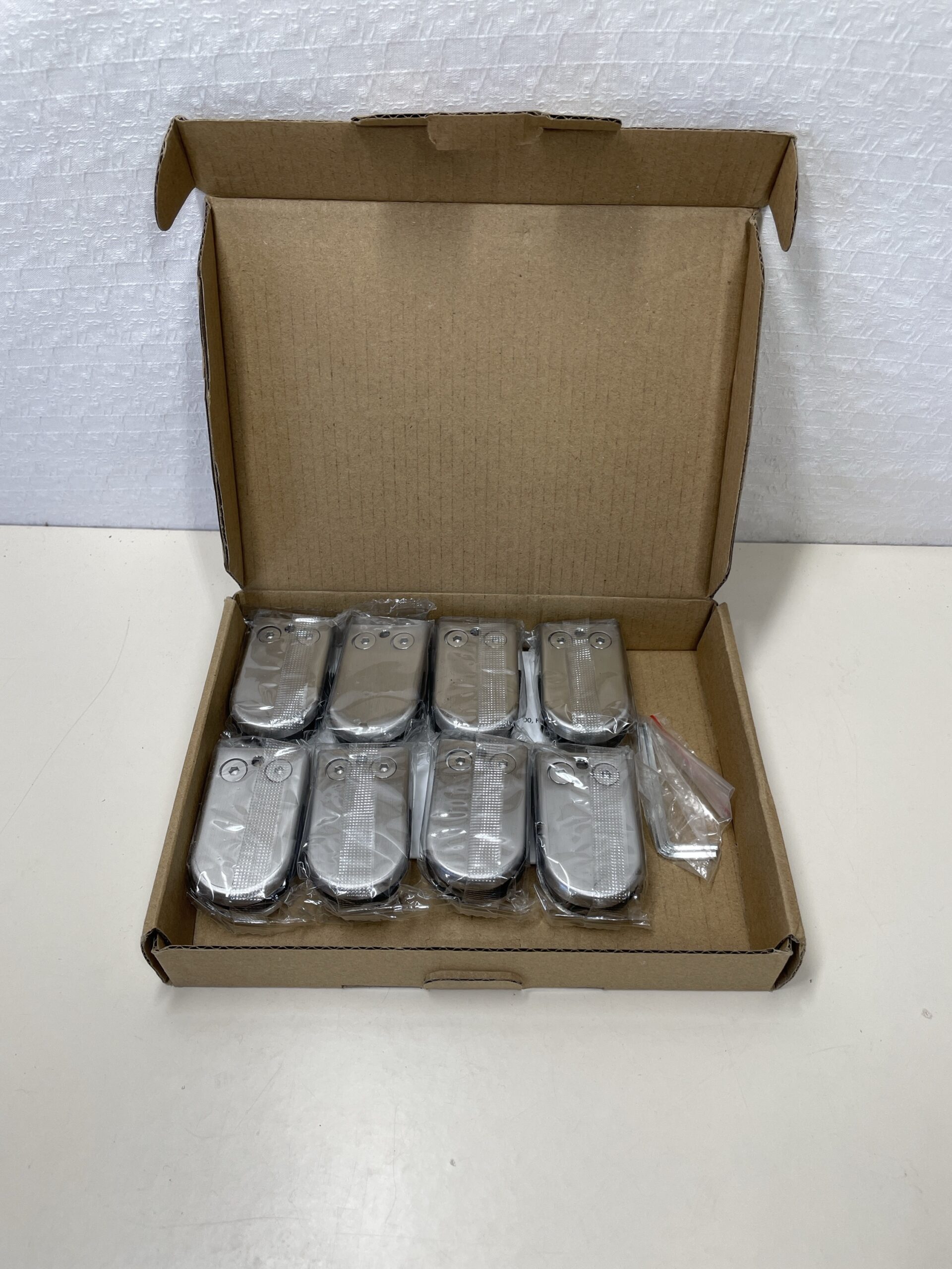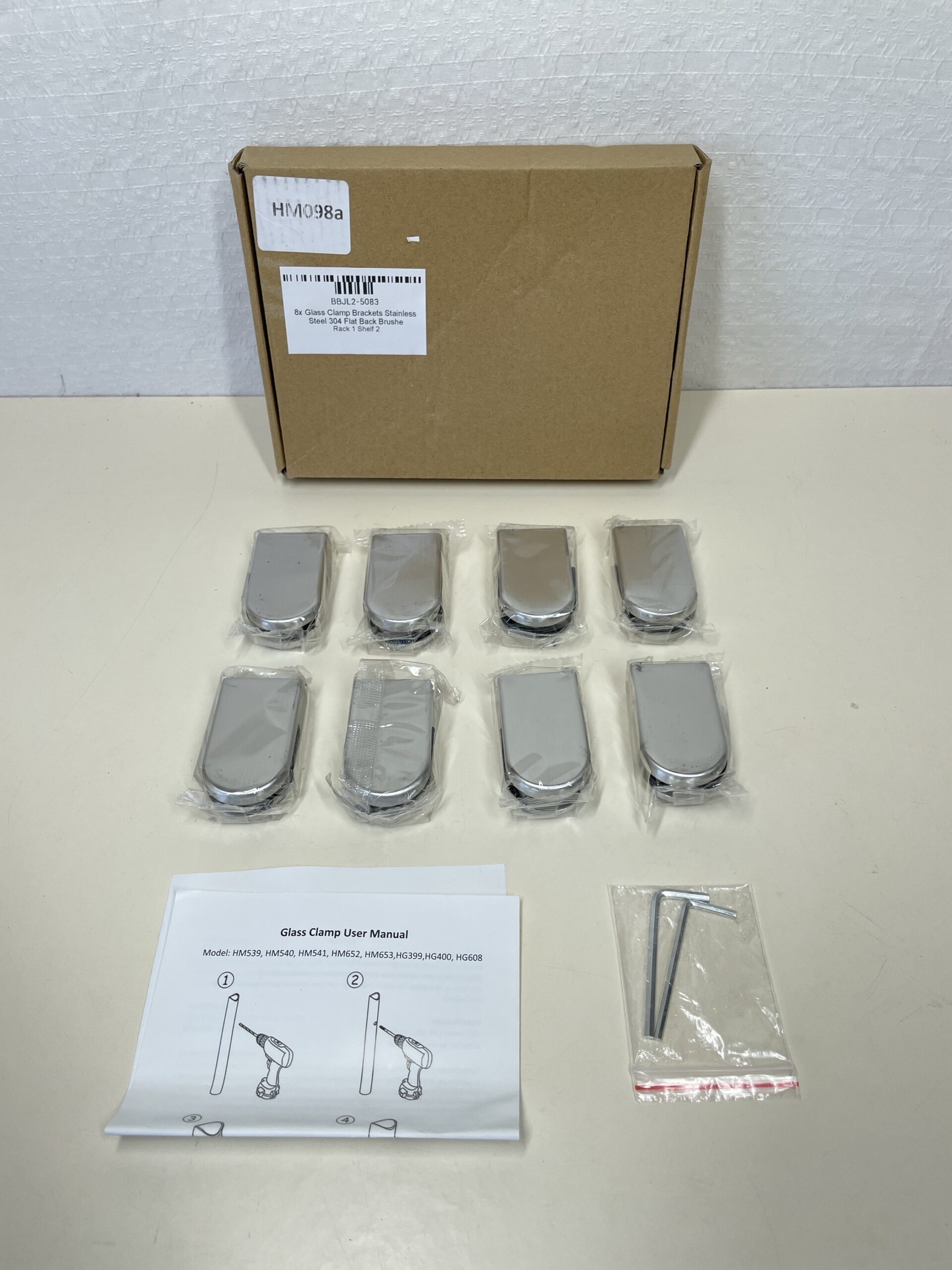 This 8 piece box of Glass Clamp Brackets is listed as new other as the box has been opened, but all clamps are included and still sealed inside of their packaging. They are all in a pristine codnition, showing no signs of damage or previous use. There are also two spare Allen keys included with the set. Please see images.