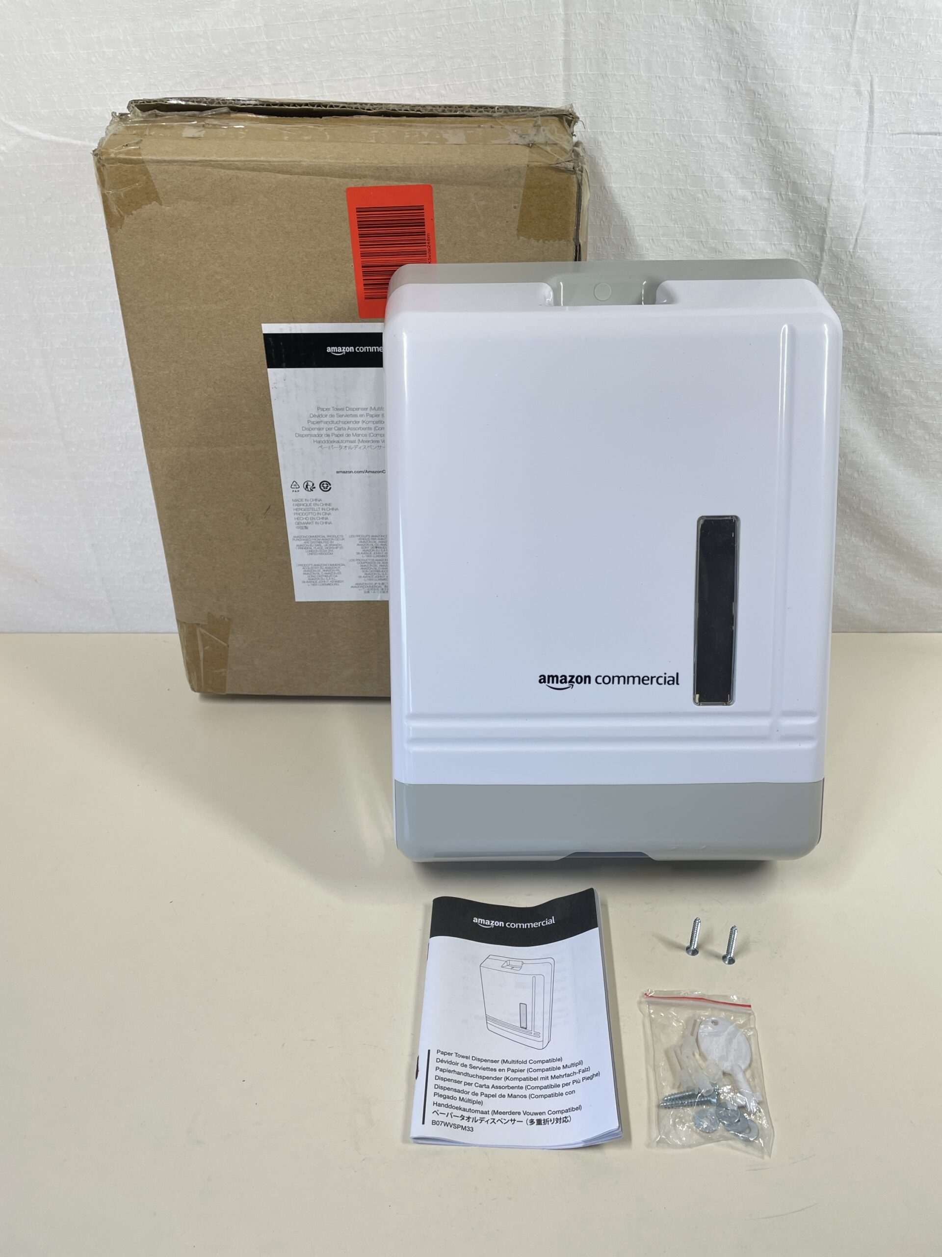 -33%This AmazonCommercial Multifold Paper Towel Dispenser is listed as new other as the box has been opened and has some minor damage, but the item inside shows no signs of previous installation or damages. The user guide, all fitting parts and the box key are all included and in a pristine condition. Please see images.