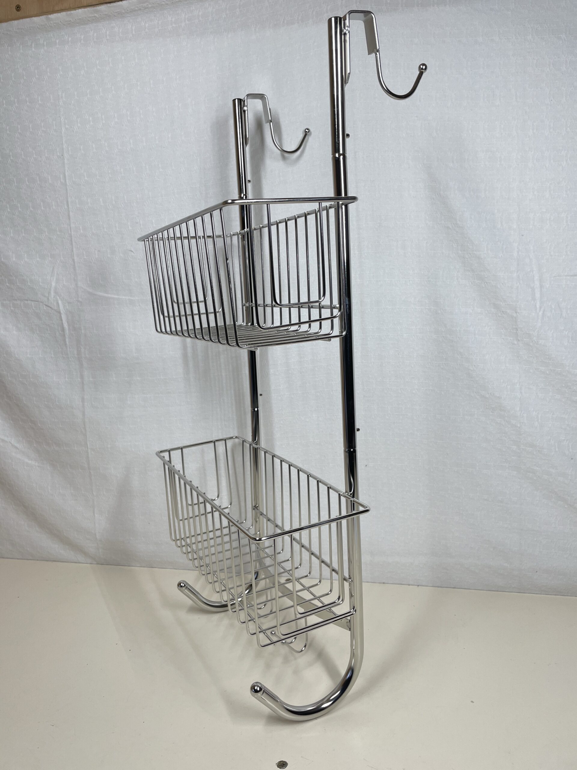 This hanging shower caddy provides spacious storage without drilling. Features chrome-plated construction with rubber padding to protect doors and prevent slipping.