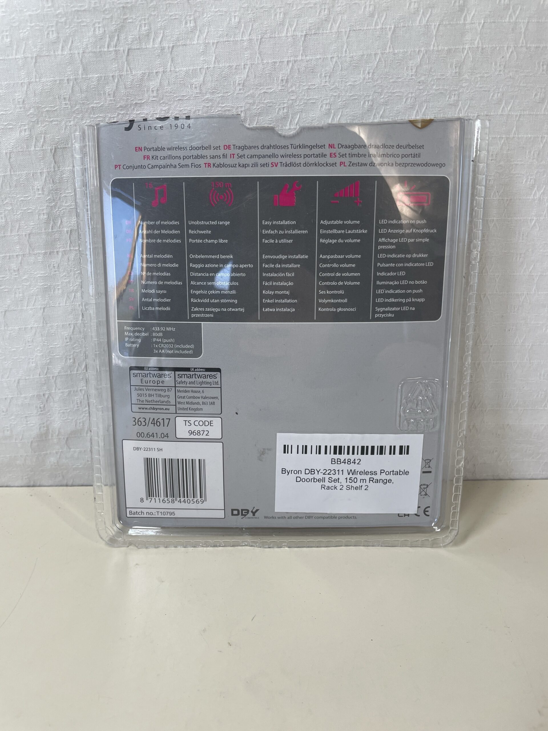 WEATHER RESISTANT: the Byron wireless portable doorbell set is built with an IP44 protection rating. This ensures that the doorbell is durable and can withstand various weather conditions, making it suitable for both indoor and outdoor use.