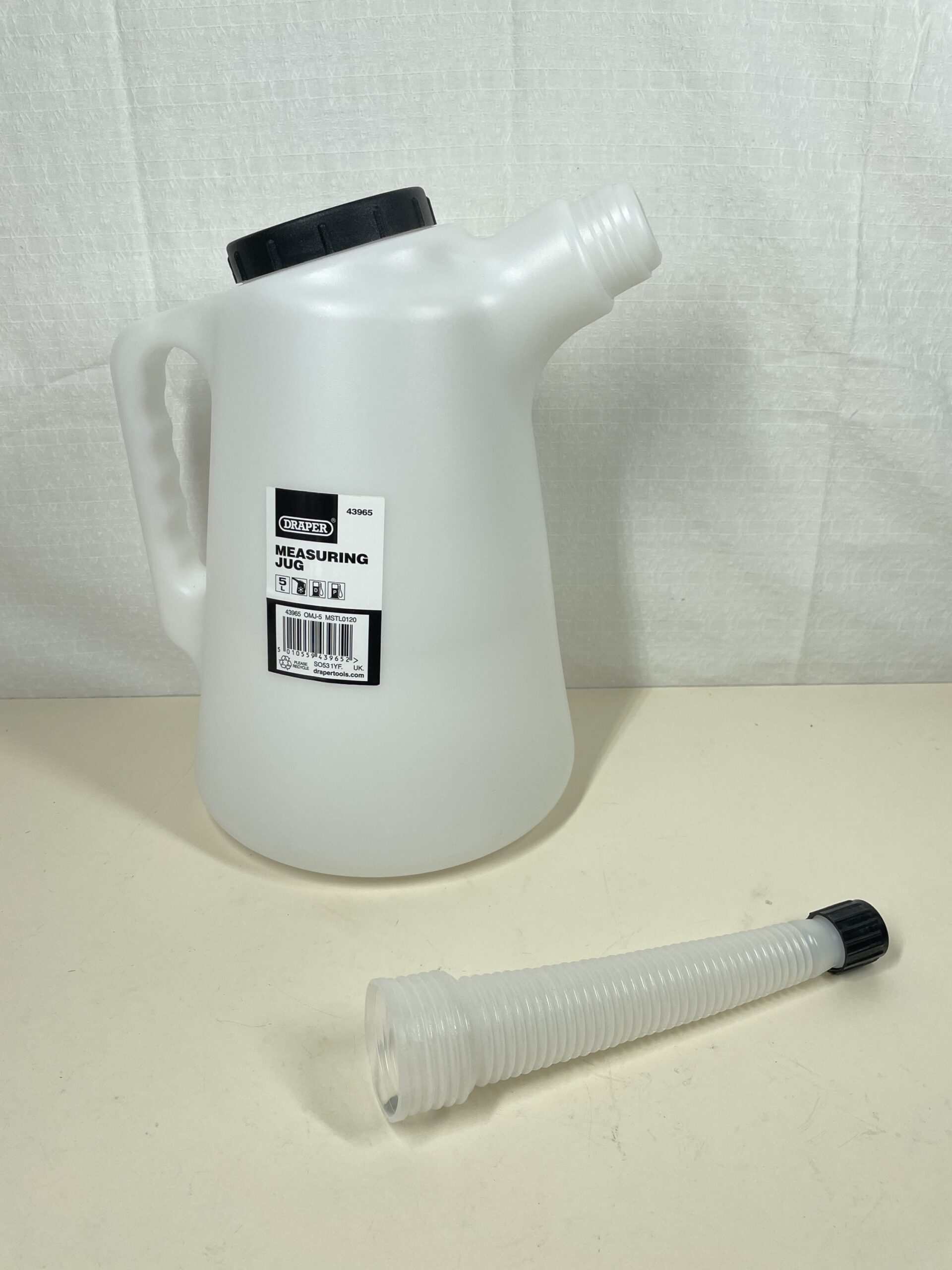 - Features: Metric and US imperial graduations on jug body Manufactured from high-density polyethylene, which is resistant to diesel/petrol, oils and most acids Fitted with a flexible spout and carrying handle and attached with a screw top lid Inscribed with metric and imperial graduations on the jug body All in all, an extremely practical measuring jug for a host of tasks performed by mechanics and vehicle technicians in workshops and garages