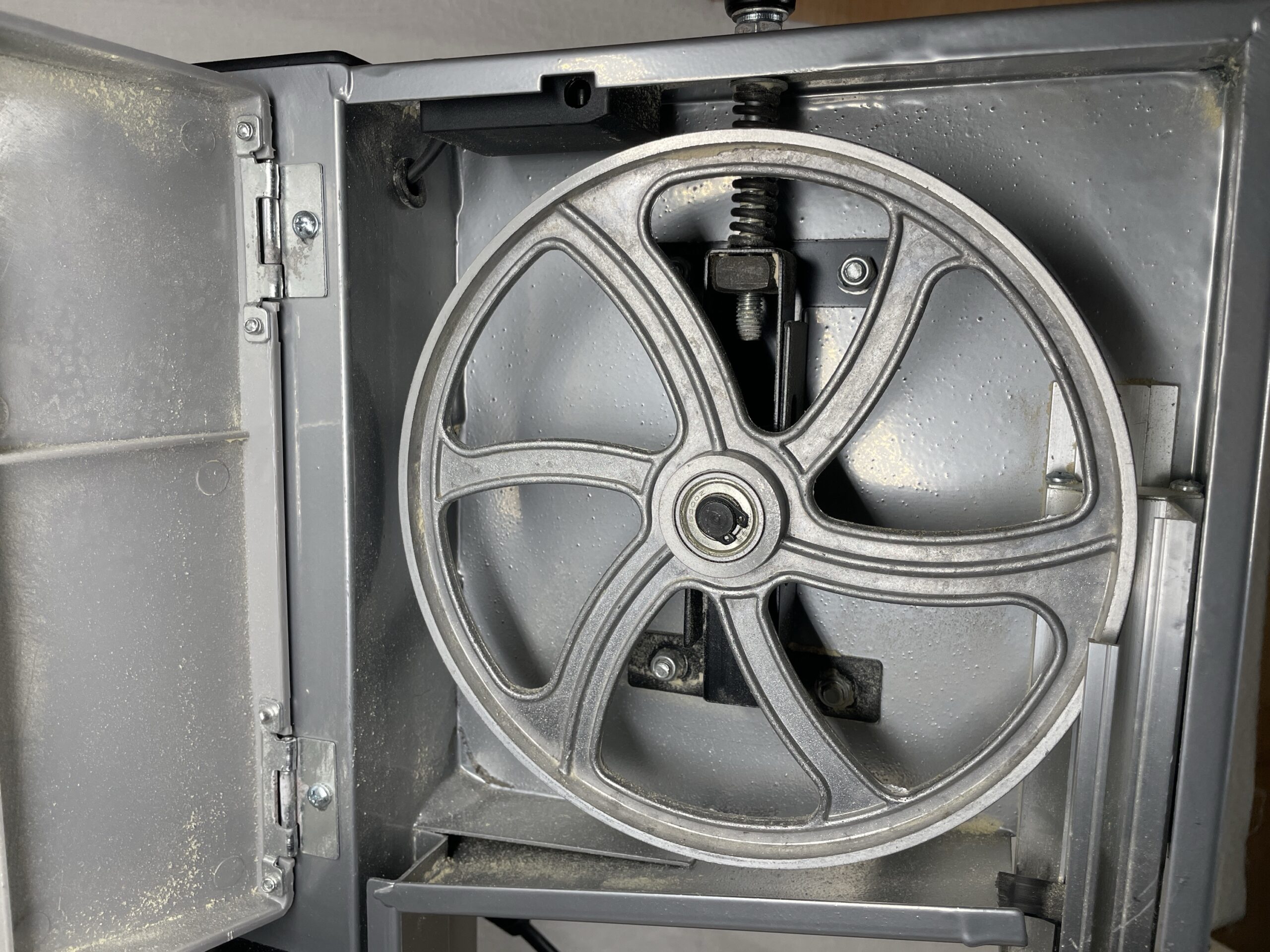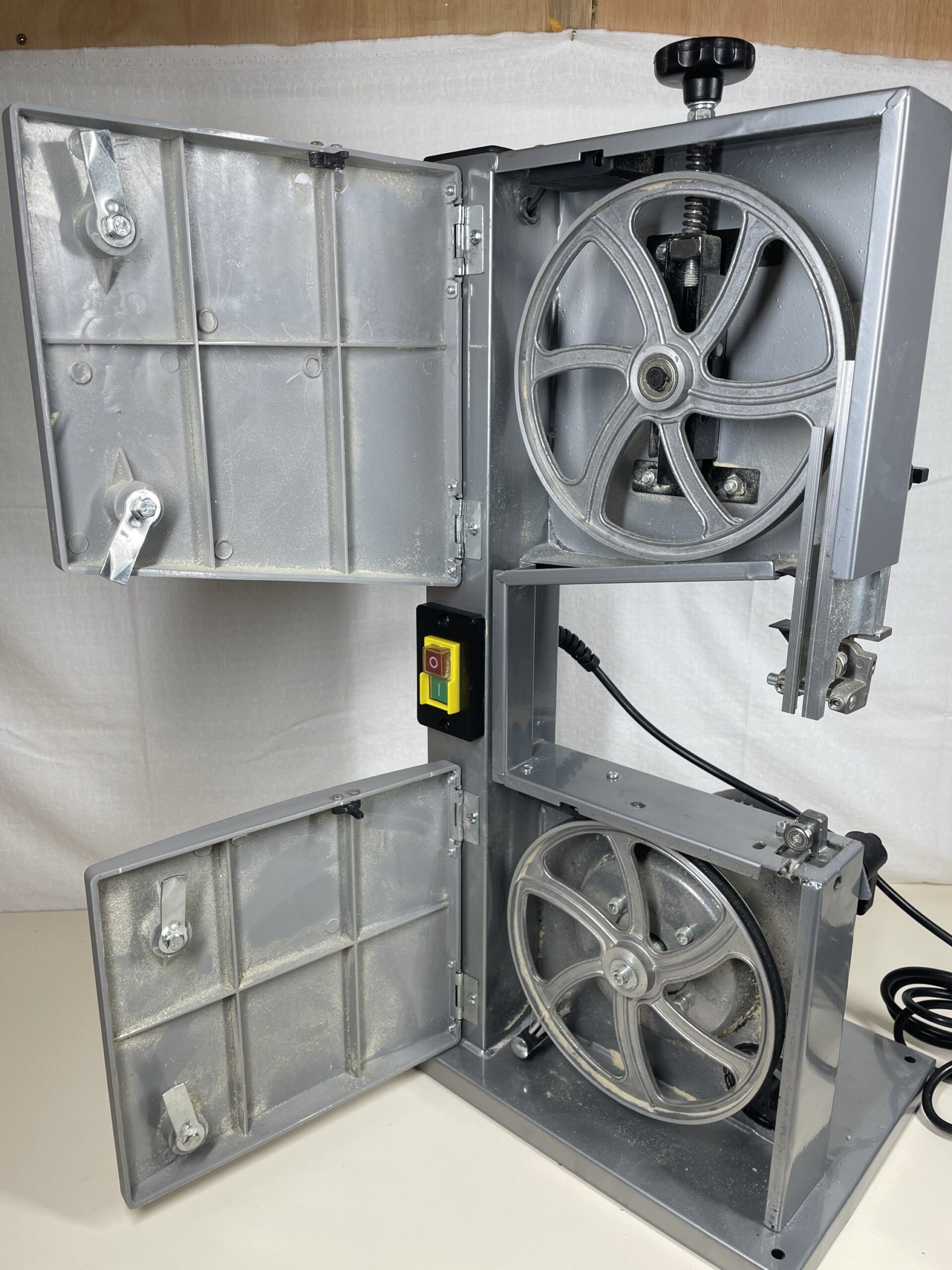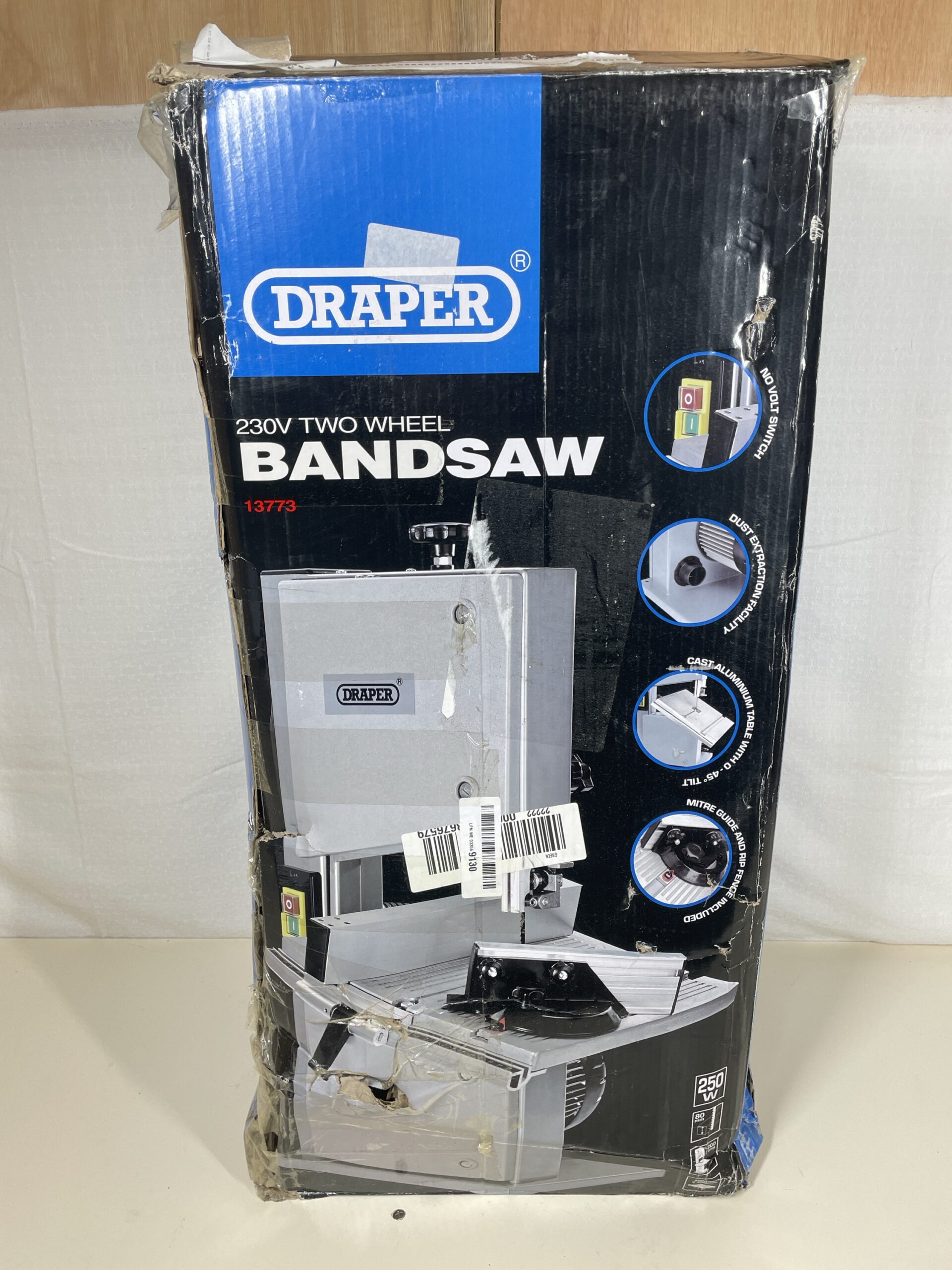 -33%This Draper 82756 Two Wheel Bandsaw is listed as used as there are signs of previous cutting, with sawdust in the interior nooks and crannies, and a minor amount of surface rust to a few ares (all pictured). Other than these points of note the saw has been put together and switched on to ensure that the parts for assembly are included and that the item will power on and run without issue. I am pleased to say that there are no issues with the item’s Electrical or mechanical function. The bandsaw itself is unfortunately not included. The box is damaged but the item will be well packaged for delivery. Please see images.