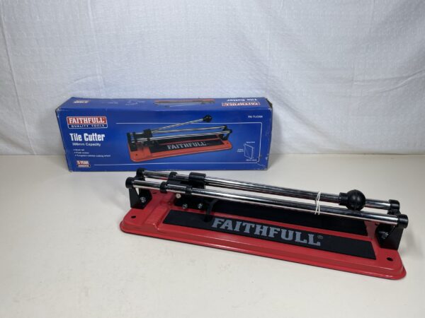 The Faithfull 300mm Tile Cutter is a manual tile cutter, ideal for small projects when working with wall, floor and quarry tiles. With a maximum cutting capacity of 300mm square, 210mm diagonal and up to 10mm thick, it is designed to handle most common small tiling projects with ease. Featuring dual solid chromed rails and a ball-bearing sliding handle, the cutter provides smooth and accurate scoring for clean, professional-quality cuts. The durable tungsten carbide cutting wheel ensures precision and longevity, helping you achieve reliable results across multiple projects. For best results, score the tile using even forward pressure, then to snap, ensure wheel is clear of tile edge and bring handle down firmly, applying even breaking pressure by holding the handle and machine. Scoring multiple times instead of forcing the snap reduces the risk of handle strain and tile breakage. Always ensure this cutter is suited to your tile size, thickness and project you are undertaking. Larger Faithfull models are available if greater capacity and usage is required. This model is not designed for use on porcelain tiles. For harder materials, a specialist cutter is recommended. Extra features such as rubber bump stops and non-slip feet improve safety and stability, while the graduated angle guide makes angled cuts quick and simple. Compact and durable, the Faithfull 300mm Tile Cutter is the perfect tool for achieving accurate results in smaller projects; kitchens, bathrooms, walls and floors. Tile capacity: 300mm. Diagonal: 210mm. Thickness: 10mm