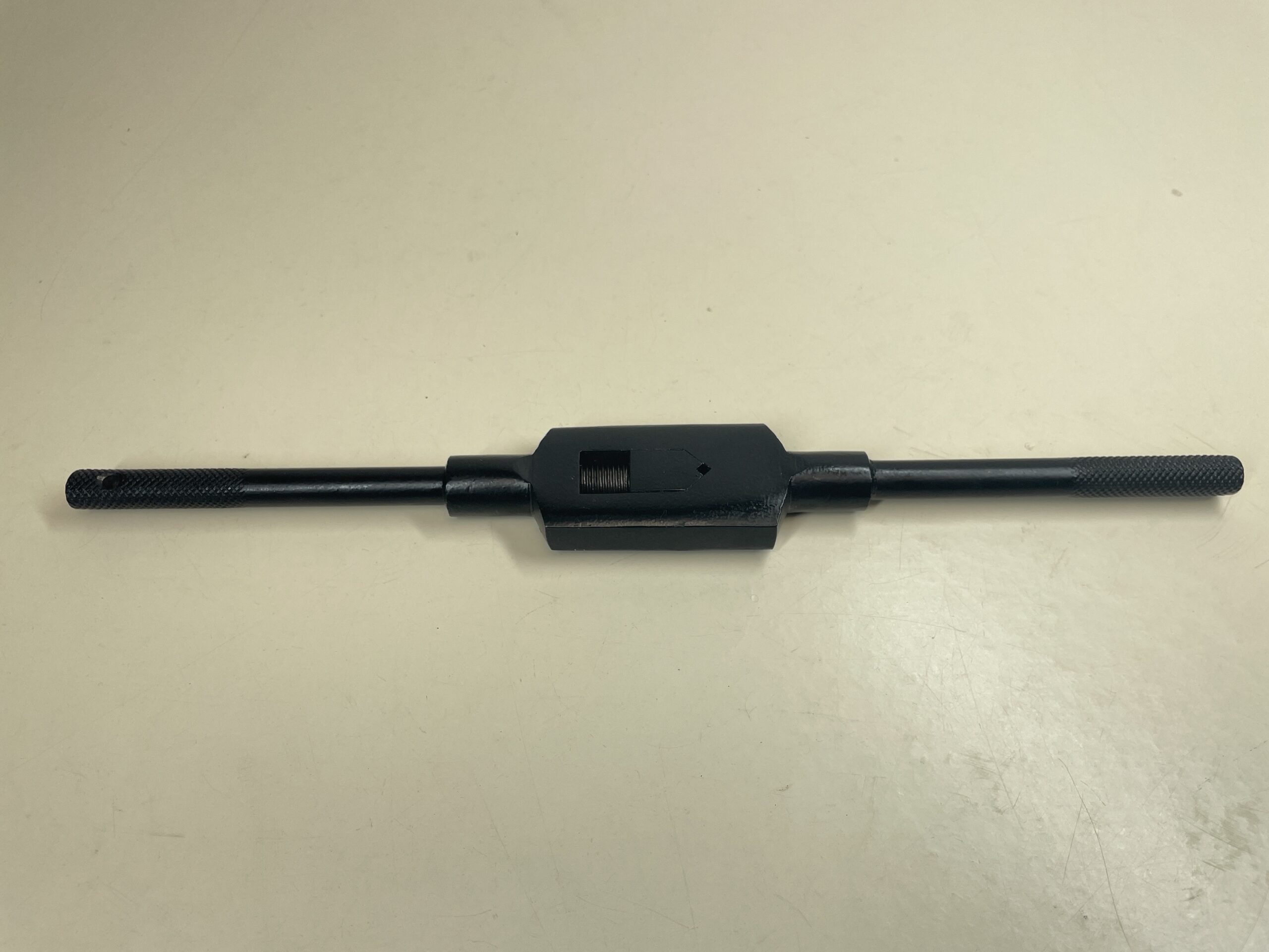 Industrial quality Bar type tap wrench manufactured from a high quality steel. The wrench body is black powder coated and houses two steel jaws. Both handles are chrome plated with the moveable handle being knurled on one end for positive grip and control.