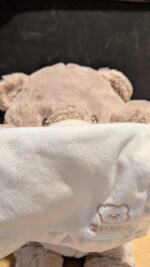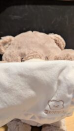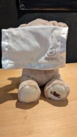 - PEEK-A-BOO TEDDY BEAR: The 11.5″ Peek-a-Boo bear recites one of six different phrases while animated mouth and arm movements recreate a fun peek-a-boo game with baby Features a satin-accented blanket for additional tactile sensation