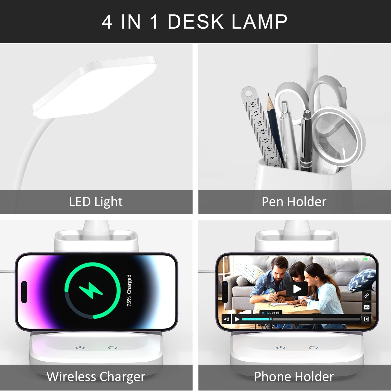 hansang Desk Lamp, LED Desk Lamps for Home Office, Wireless Charger Small Desk Lamp with Pen Holder, 3 Color Modes, Dimmable, CRI 85, 800 LM, Study Lamp for College Dorm Room, Adapter Included, Black