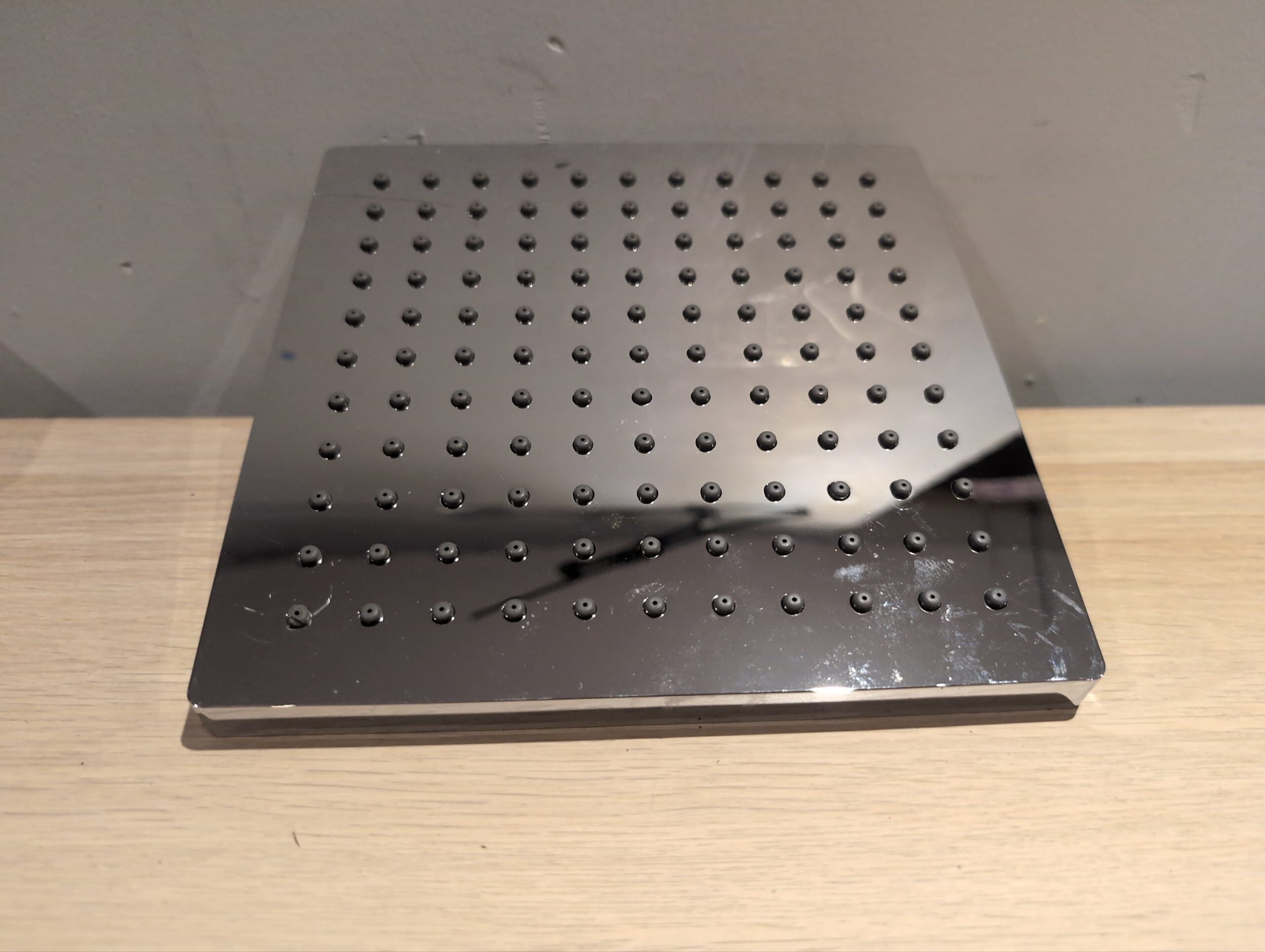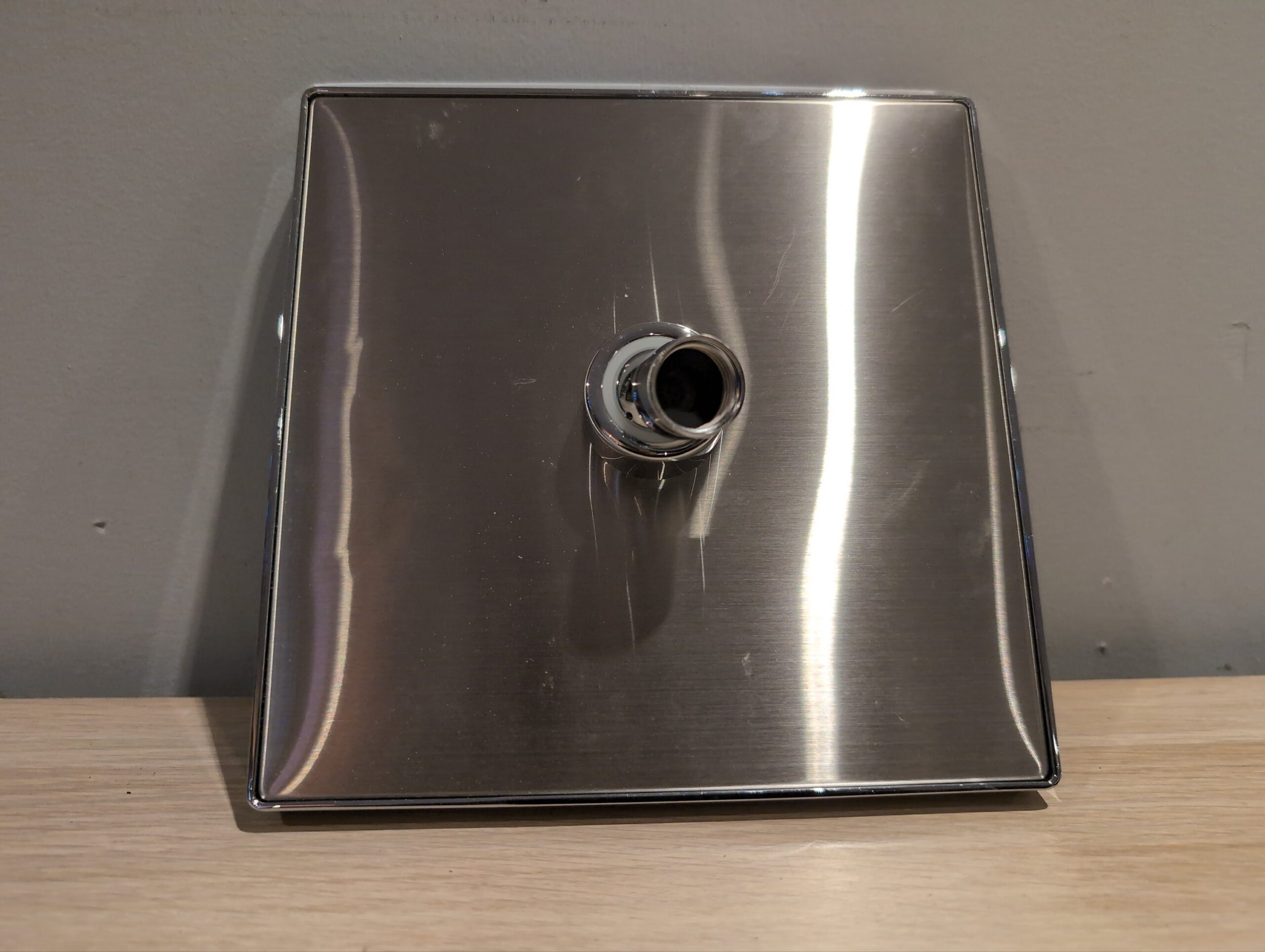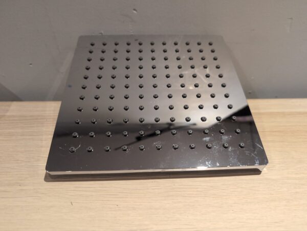 The shower head is in fair condition, there is a scratch towards one of the edges. It is otherwise in good working condition