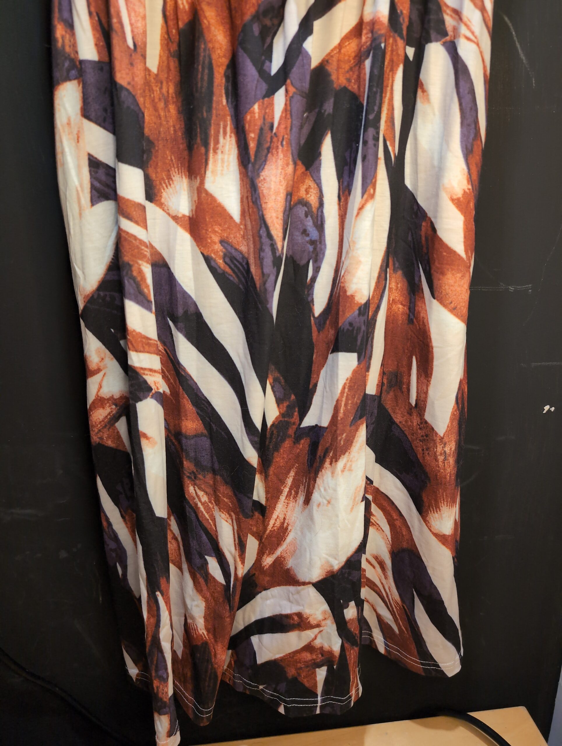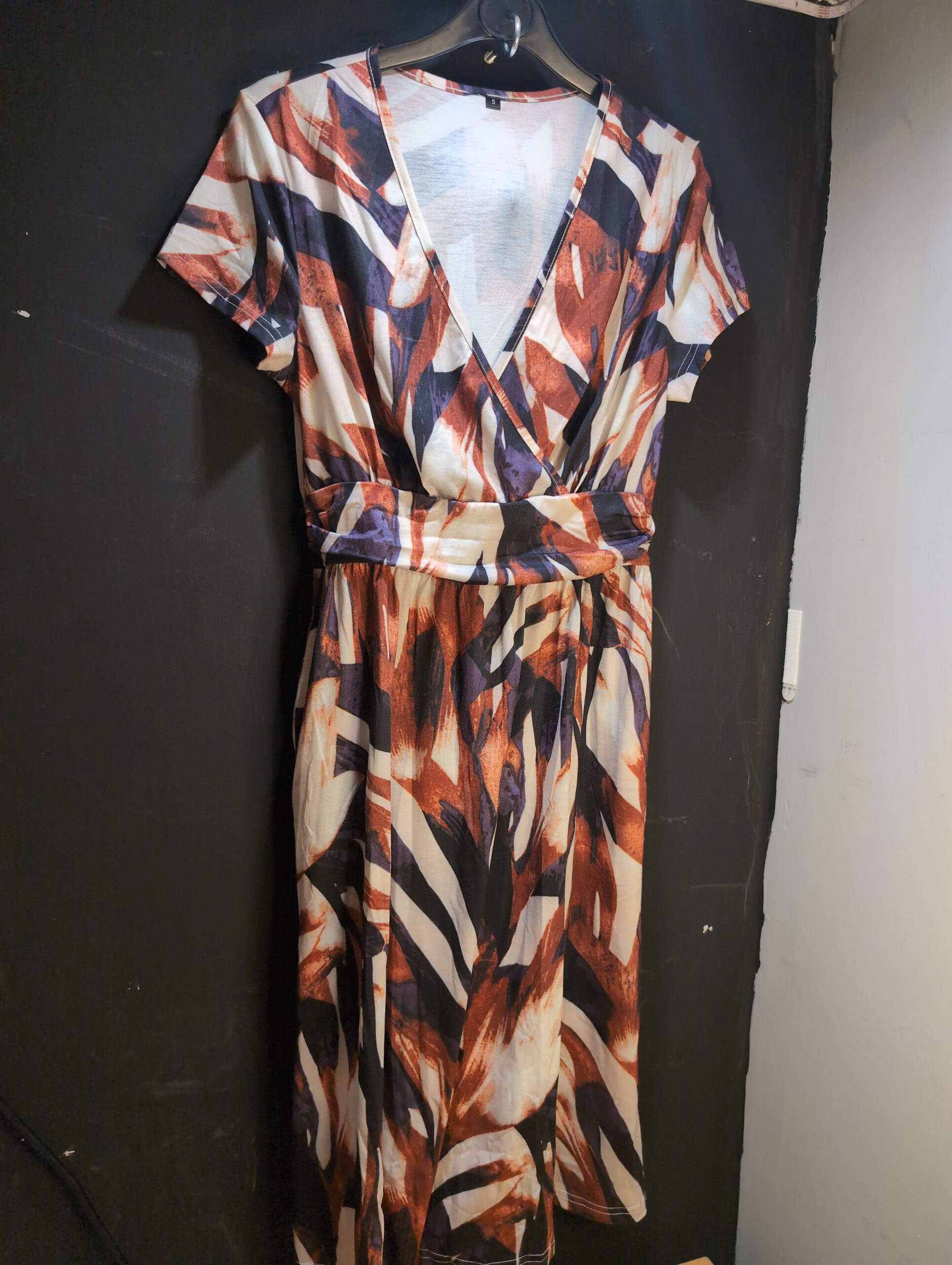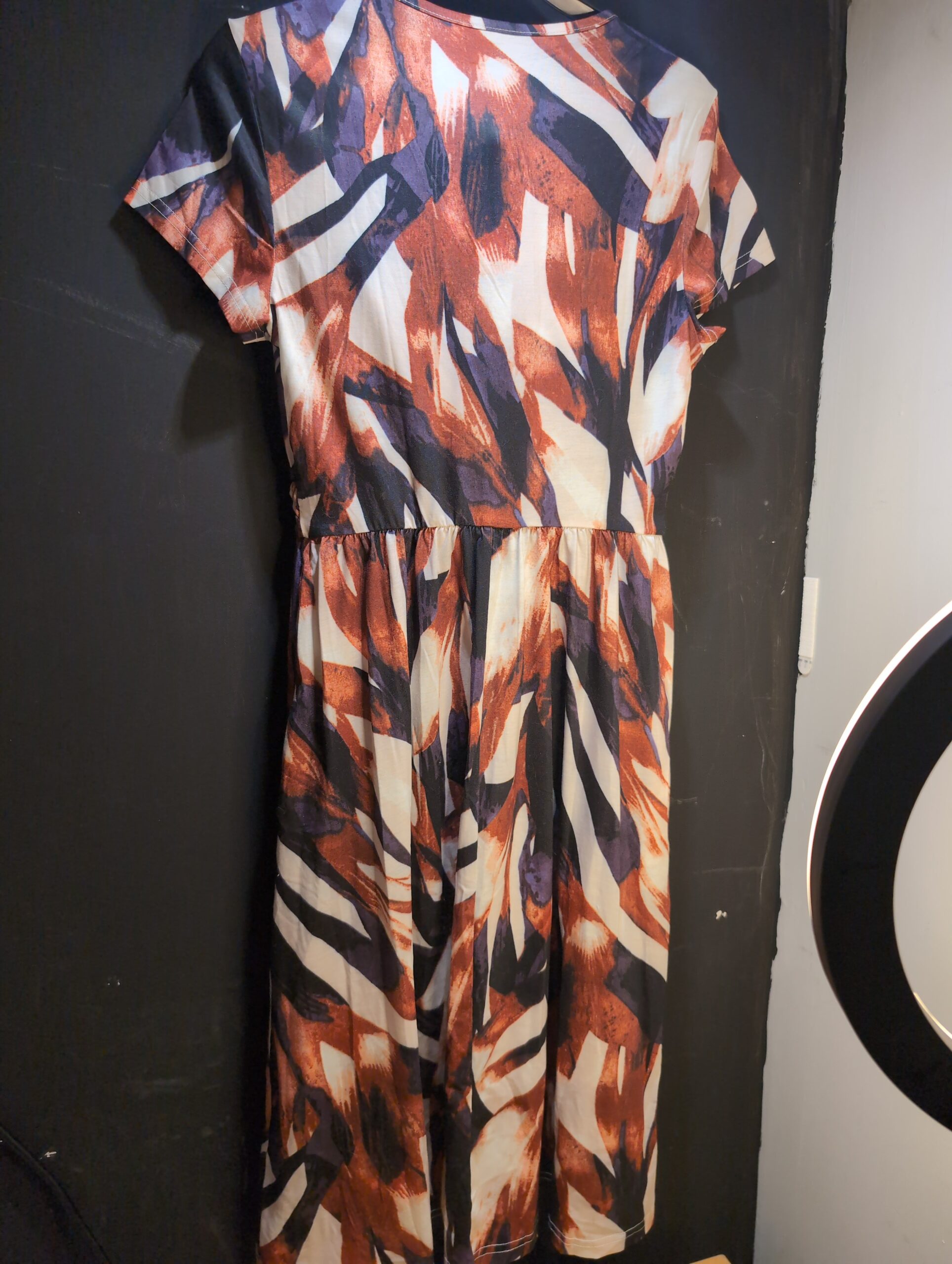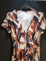 • The vivid pattern of this v-neck pattern dress is minimal to call attention to the wearer without distracting.
