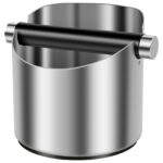 Professional espresso knock box designed for efficient coffee grounds disposal. Features non-slip rubber ring base and removable knock bar for easy cleaning.