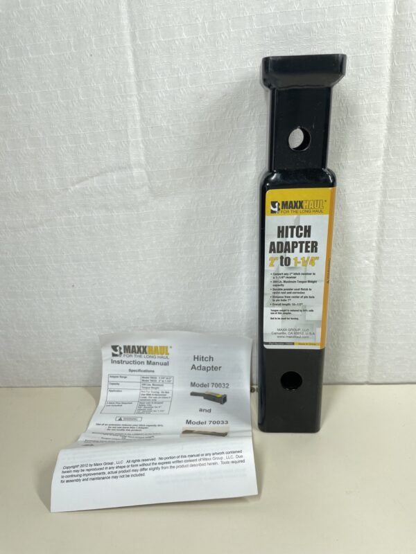 This Maxxtow hitch adapter converts your 2 inch receiver to accept 1-1/4 inch hitch mount accessories. Not to be used for towing a trailer. All Maxxtow ball mounts have a heavy duty black powder coat finish to resist rust and corrosion and are manufactured and tested to meet all current SAE safety standards.