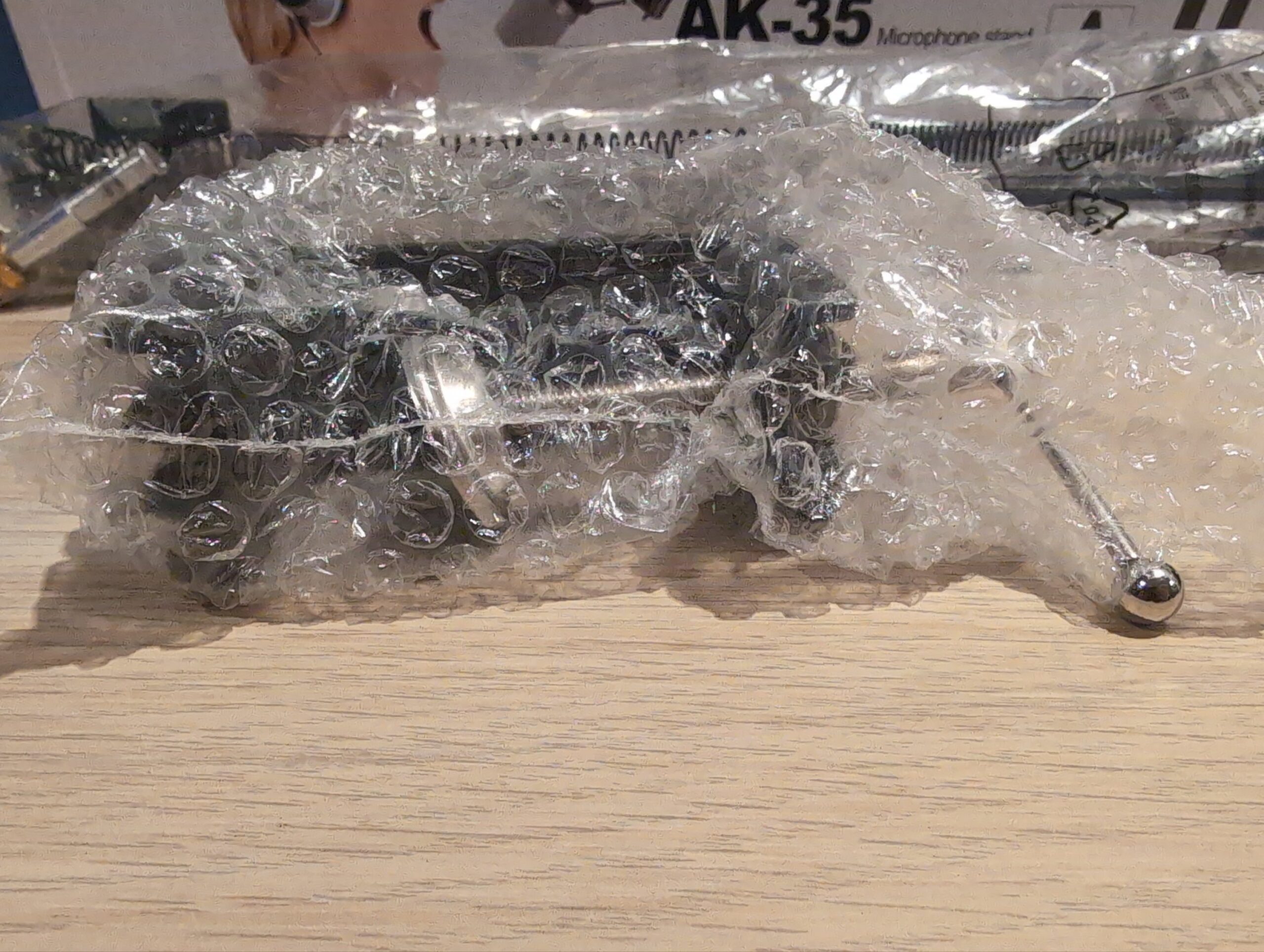 The microphone stand has been opened. It is missing the holder and wire straps but everything else is present