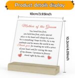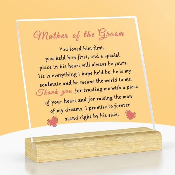 Mother of The Groom Gifts from Groom: Acrylic Plaque with Stand printed with some words. “Mother of the Groom You loved him first,you held him first, and a special place in his heart will always be yours. He is everything I hope he’d be, he is my soulmate and he means the world to me.Thank you for trusting me with a piece of your heart and for raising the man of my dreams. I promise to forever stand right by his side.”Let your mother know what she means to you with this heartfelt gift.
