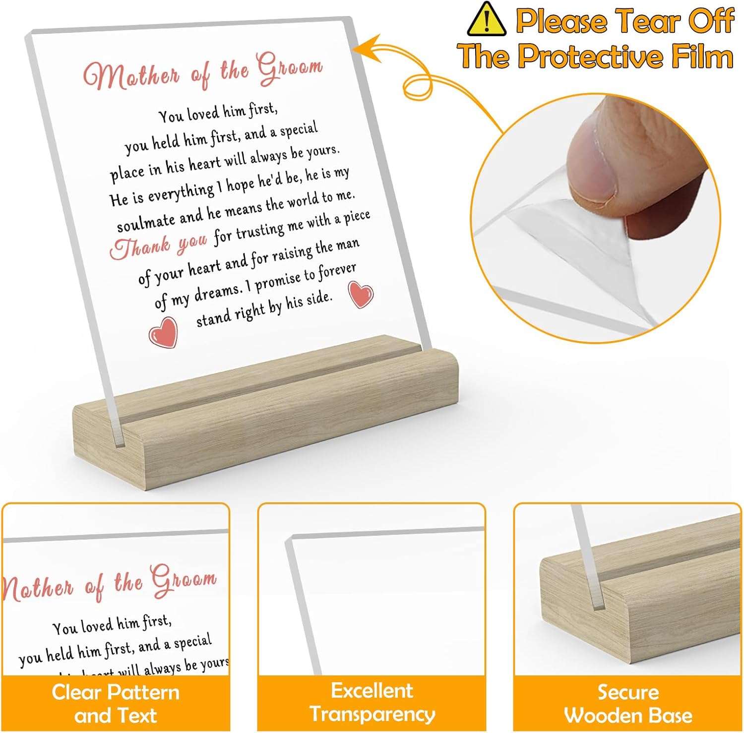 Mother of The Groom Acrylic Sign:This clear acrylic sign gift is designed in a square shape, made of transparent acrylic material, with meaningful words and patterns, good printing technique, and clear graphics and texts.The base is made of wood, sturdy and stable.size:3.93×3.93(inch) Square Acrylic, L3.93x W1.37x H0.59(inch)Wooden Stand.which is proper to be placed on the table or desk without taking up too much space, easy to store and carry.