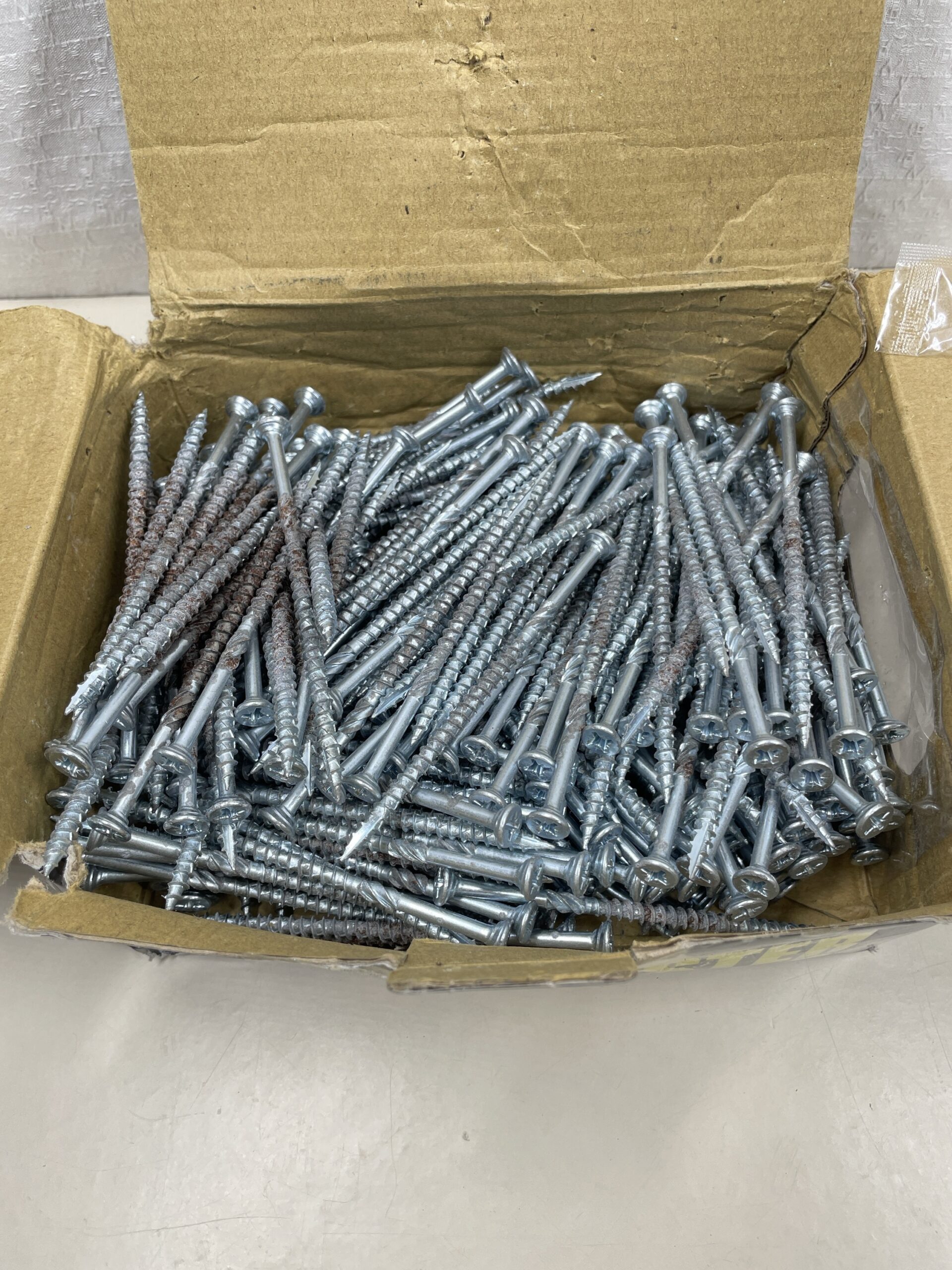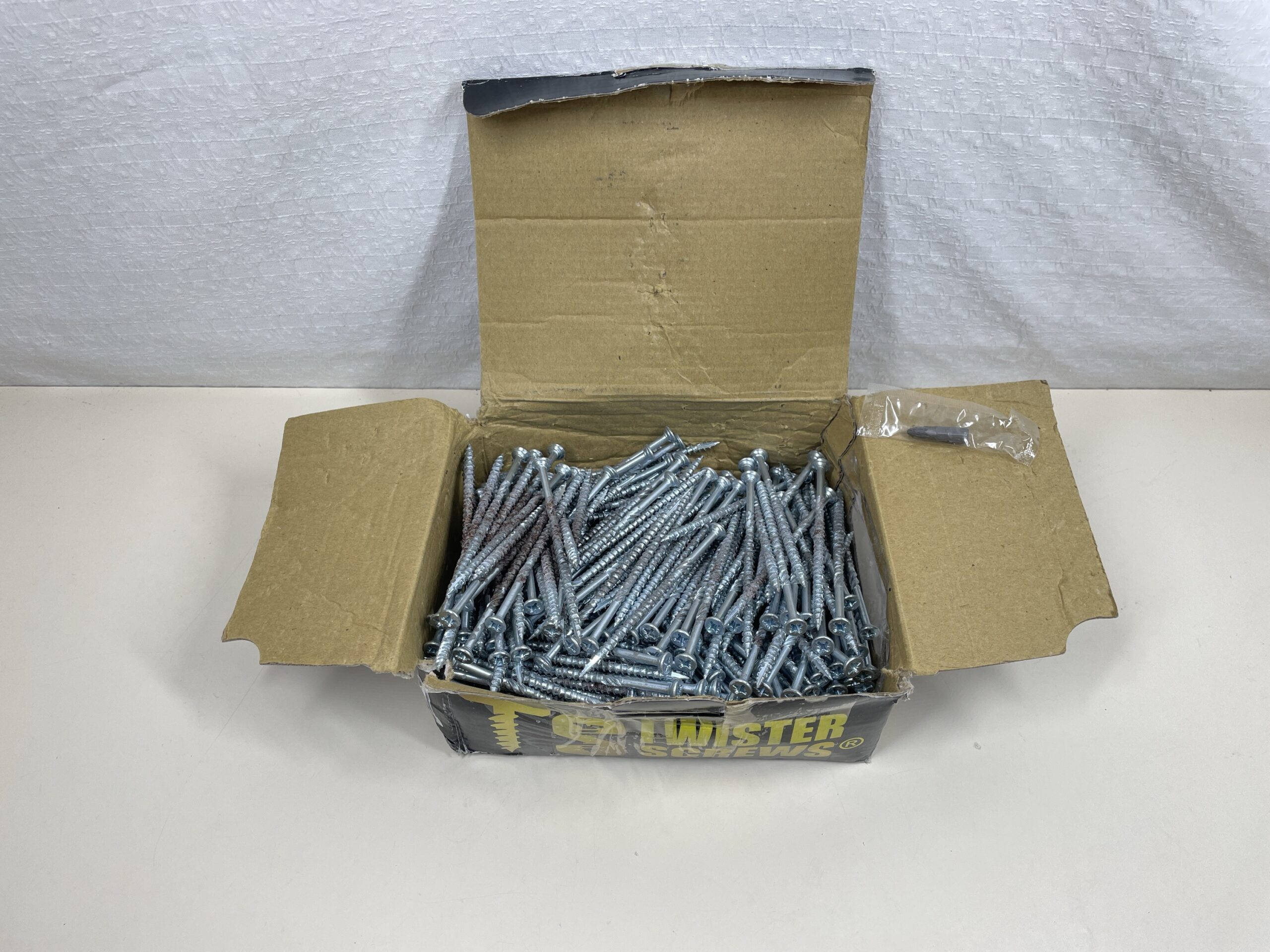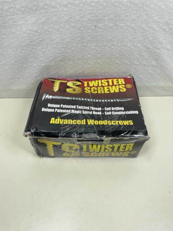 This 250 piece set of MS Twister Advanced Wood Screws are listed as used due to the fact that the original box is slightly damaged and a few of the screws have some minor surface rust, but the majority of the set is in a great, usable condition. The rusted screws are on the left hand side of the box in the images. The set also comes with a drill bit head still sealed in pristine condition. Please see images.