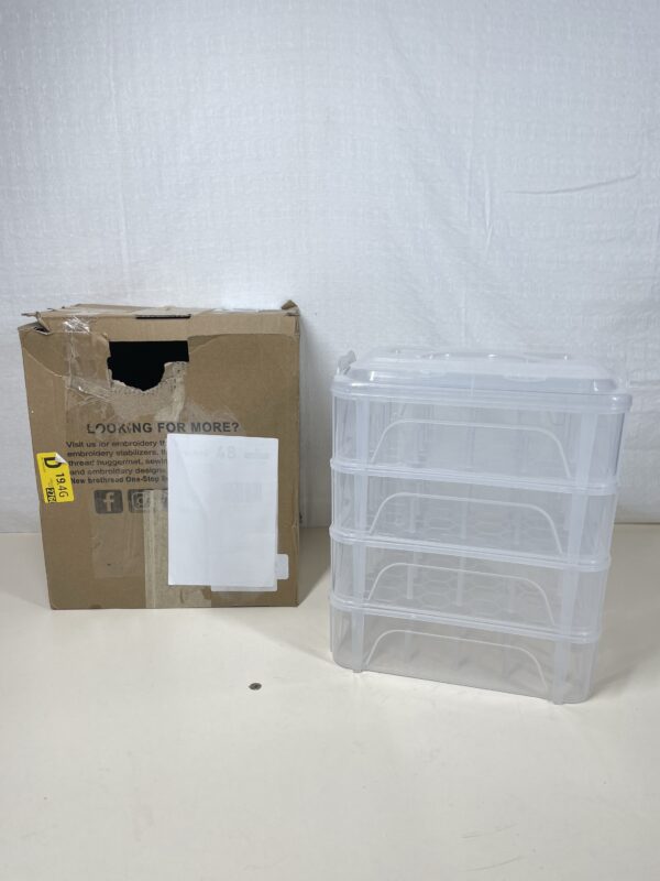 This New Brothread 4 Layer Stackable Storage Box for Thread Spools is listed as new as the item’s box has been opened and slightly damaged, but the storage box inside is in a pristine condition, showing no signs of previous use or damages. Please see images.