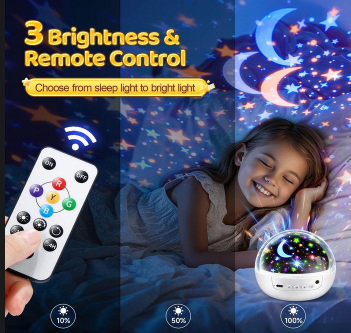 - 【TIMER+DIMMABLE BABY NIGHT LIGHT PROJECTOR】Sensory lights baby night light kids night light projector for bedroom has 3 brightness.U can adjust brightness of sensory lights for babies to make it comfortable for eyes.Baby sensory toys for babies night light kids night light projector can better protect eyes.Kids night light baby sensory lights has 4 timer (1/2/4/8h).Just set TIMER,no longer need to turn off baby night light newborn.Star projector night light projector allow kids to enjoy quiet sleep.Star projector night light kids sensory lights for autism promote independent sleep routines for kids.Pick baby night light baby sensory toys for babies as baby boy gifts baby girl gifts newborn