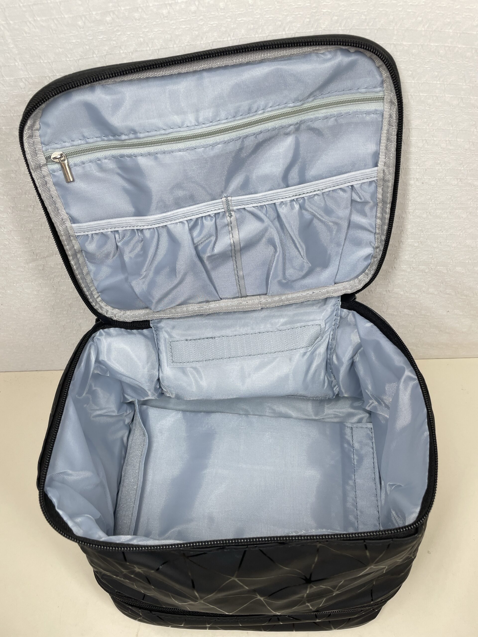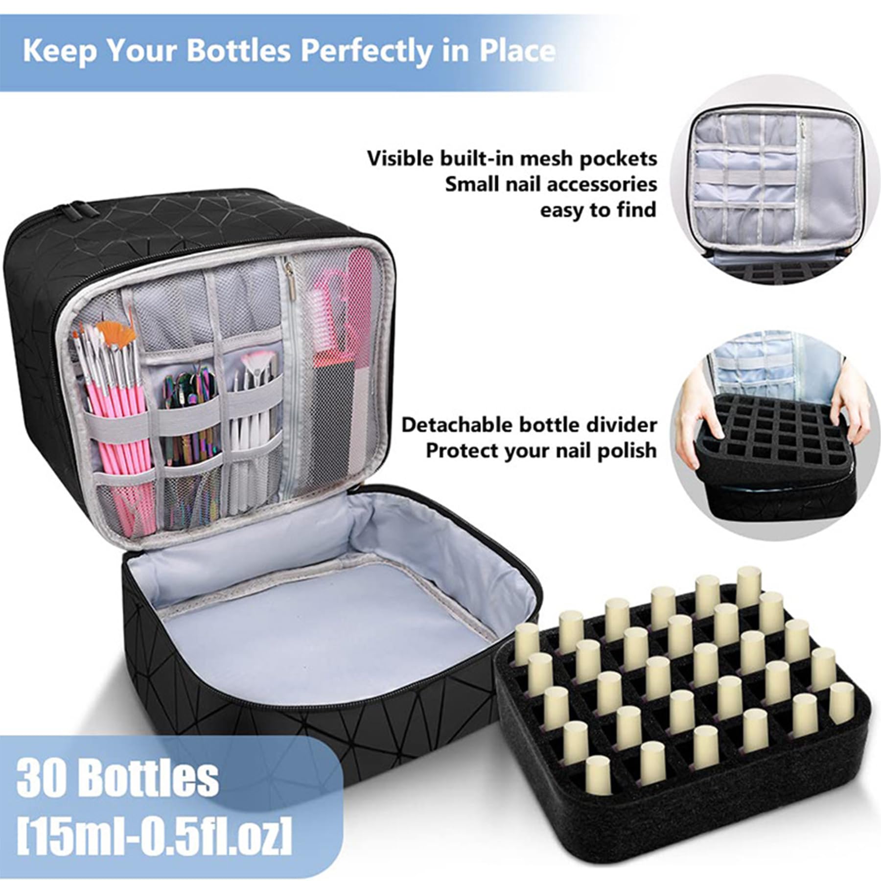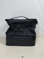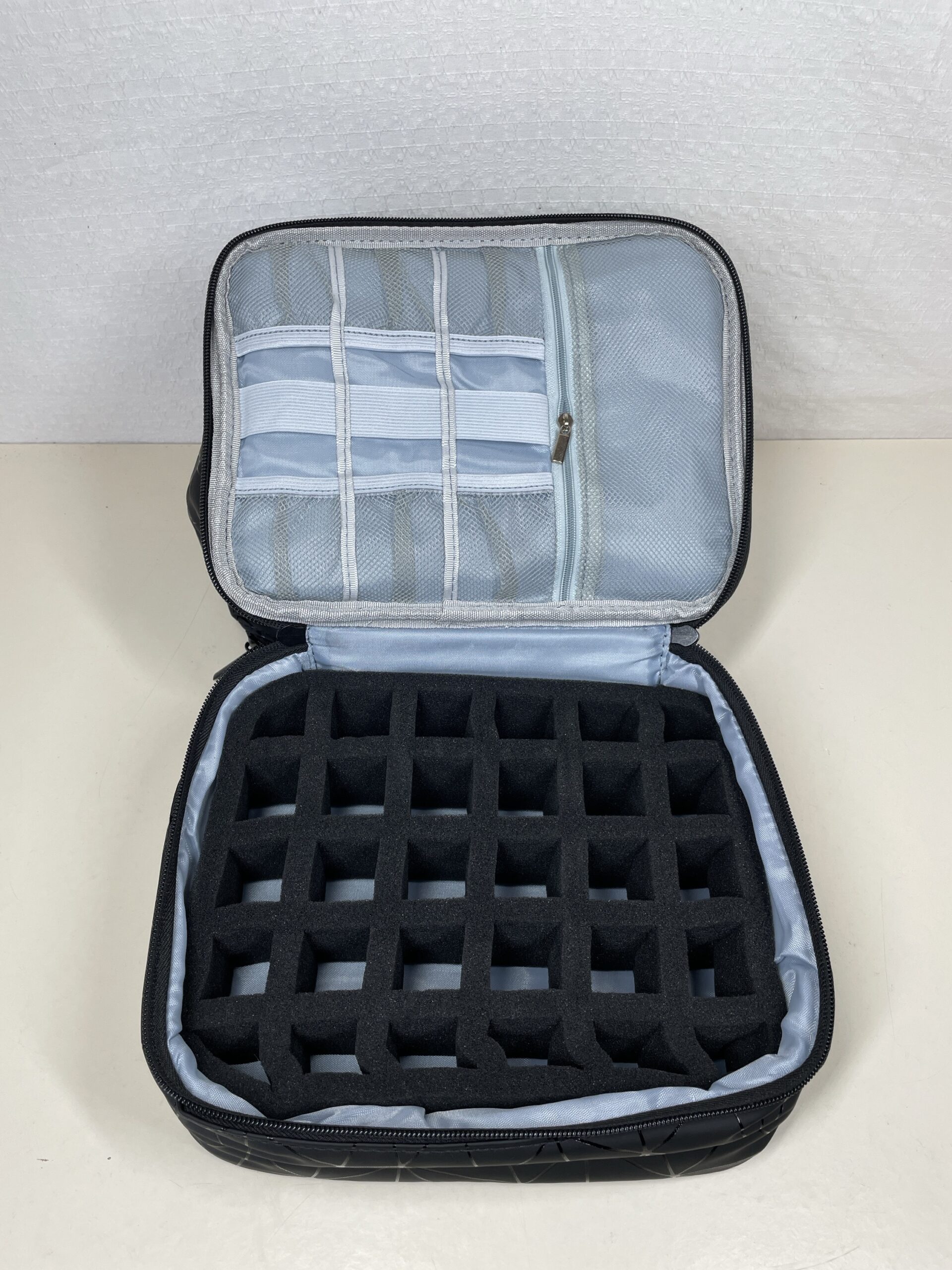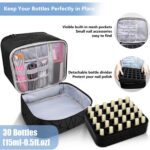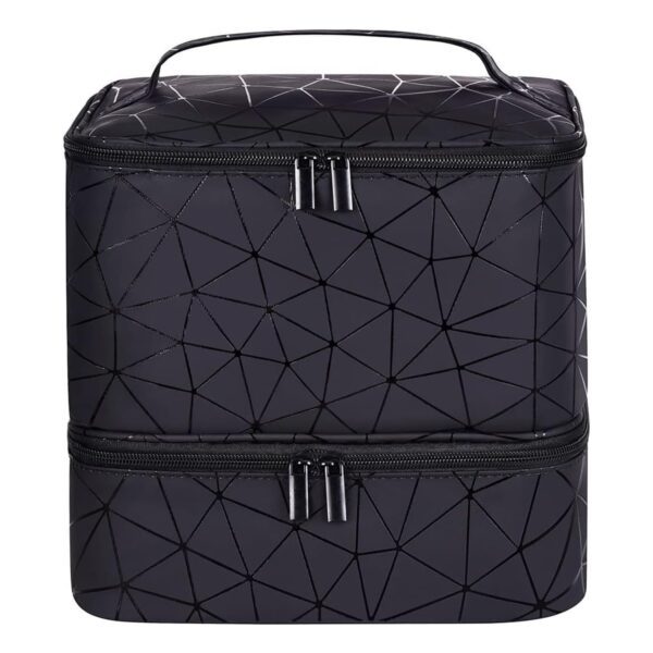 Double-layer black makeup organiser bag designed to hold up to 30 nail polish bottles with secure storage and easy transport. Perfect for nail technicians, beauty enthusiasts, and travel.