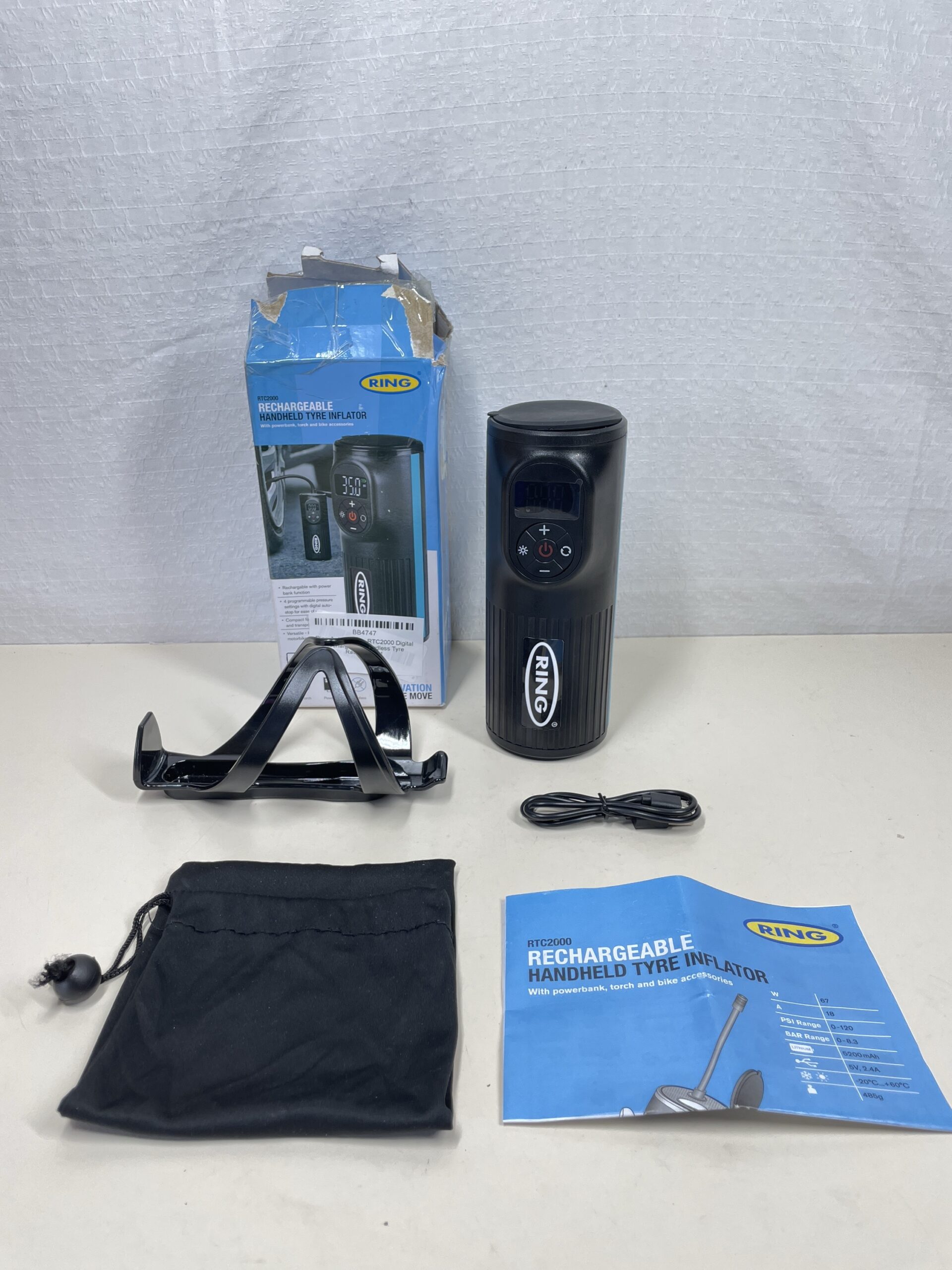 Ring Automotive – RTC2000 Digital Rechargeable Cordless Tyre Inflator Air Compressor and Electric Bike Pump with Pressure Gauge Memory LED Light Powerbank and Adaptor kit, Black