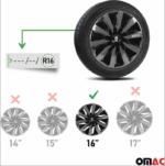 - Note If you want to choose the correct size of your wheel covers, you can find the correct size on the tire. Each tire has a code, for example 205/55 R16 80W. The number shown behind the R is the correct inch size for your hubcaps, in this case R16 stands for 16 inches