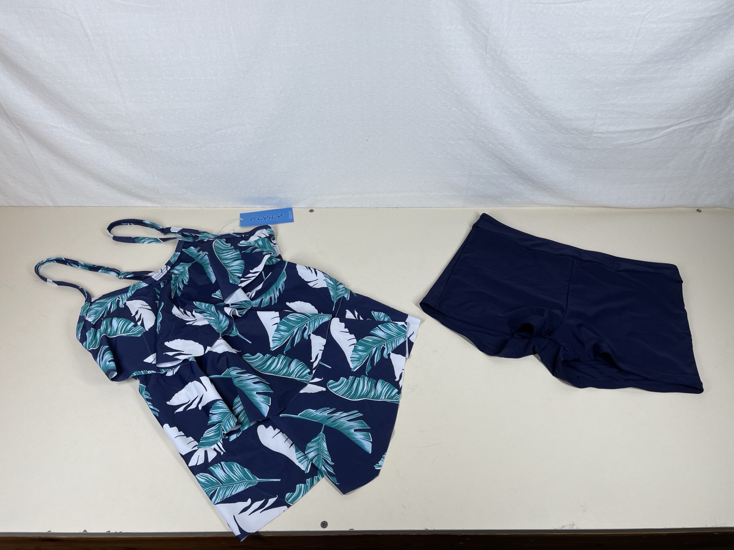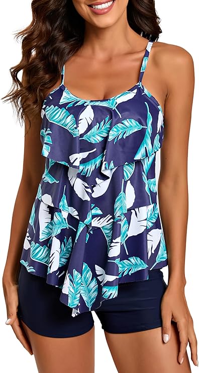 Women 2 Piece Tankini Swimsuits Flounce Printed Top with Boyshorts Plus Size Swimwear Bathing Suit (NavyLeaf,M) FLYILY